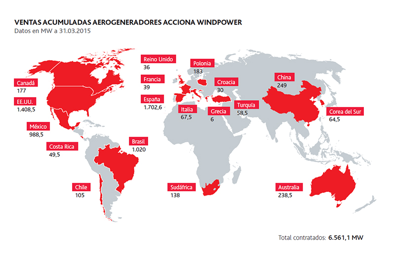 La compañía ha suscrito contratos firmes para el suministro de aerogeneradores a un total de 18 países de los cinco continentes que, a diciembre de 2015, totalizan 7.170 MW.